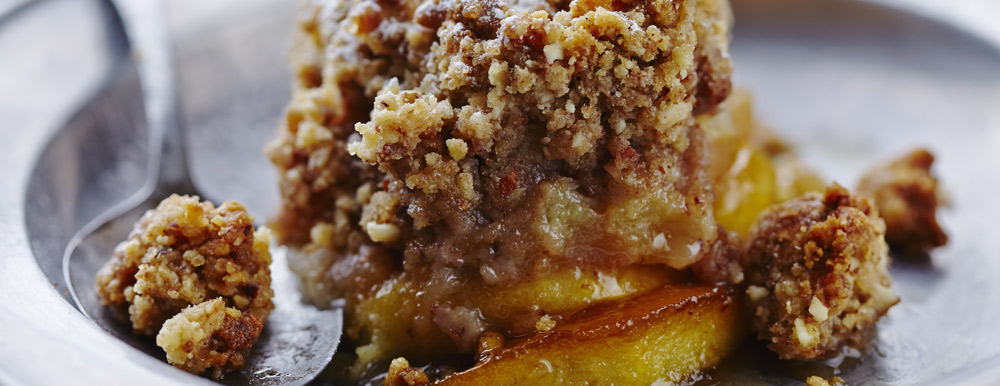 Rub the flour, butter and sugar together in a bowl with your fingertips until the mixture resembles breadcrumbs. Spoon the crumble evenly over the toffee apple mixture and place in the oven to bake for 15 minutes, or until crisp and golden-brown.